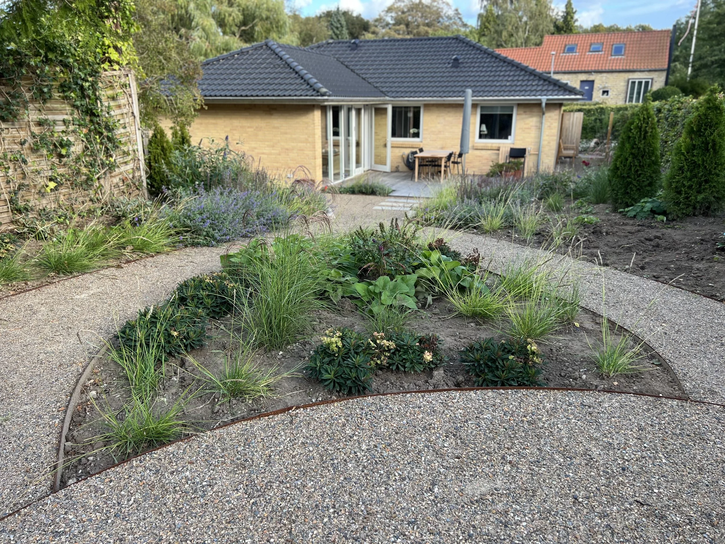 I dag har Lisbeth en naturnær og fredfyldt have, der giver masser af liv fra havens planter og insekter, og samtidig en ro og rum til at gå på opdagelse og nyde havens mange nye rum og rare siddepladser året rundt.